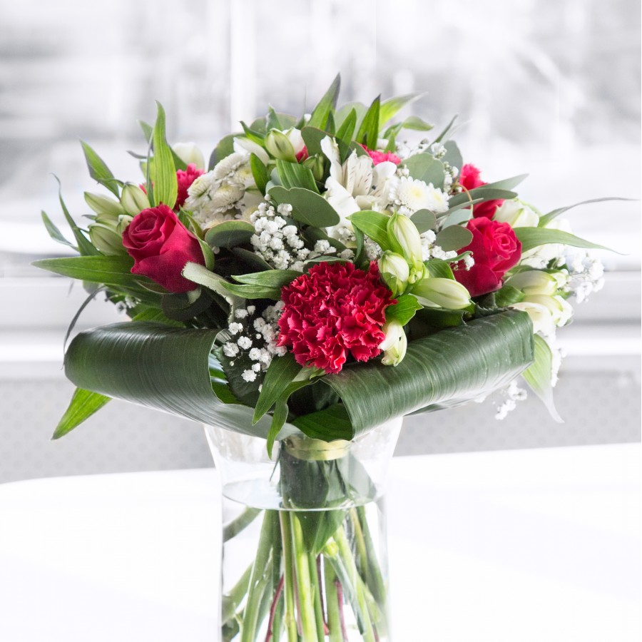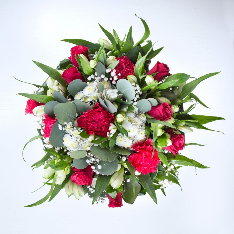 Unveil a masterpiece of natural beauty with our Majestic Floral Vision bouquet. Every element of this arrangement is thoughtfully curated, featuring an impressive selection of hand-picked blooms. Revel in the purity of mini white chrysanthemums and gypsophila, the vibrant passion of red roses and carnations, and the refined elegance of white alstroemeria paired with aspidistra leaves. This artful ensemble is designed to captivate and inspire.