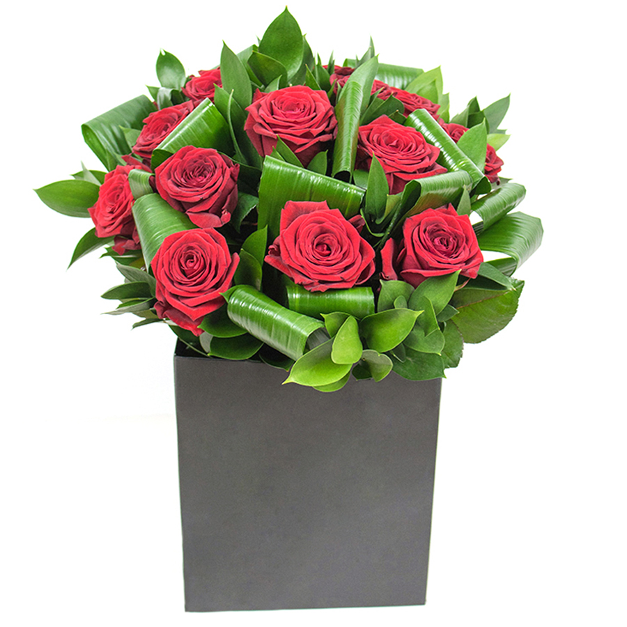 Enhance any room with our enchanting bouquet of red roses, complemented by lush aspidistra leaves and delicate ruscus. This unique arrangement offers a perfect blend of color and elegance.